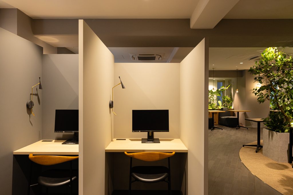 ・専用個室はデスクとチェア付き。共用設備として会議室やWEBブース、ラウンジには
